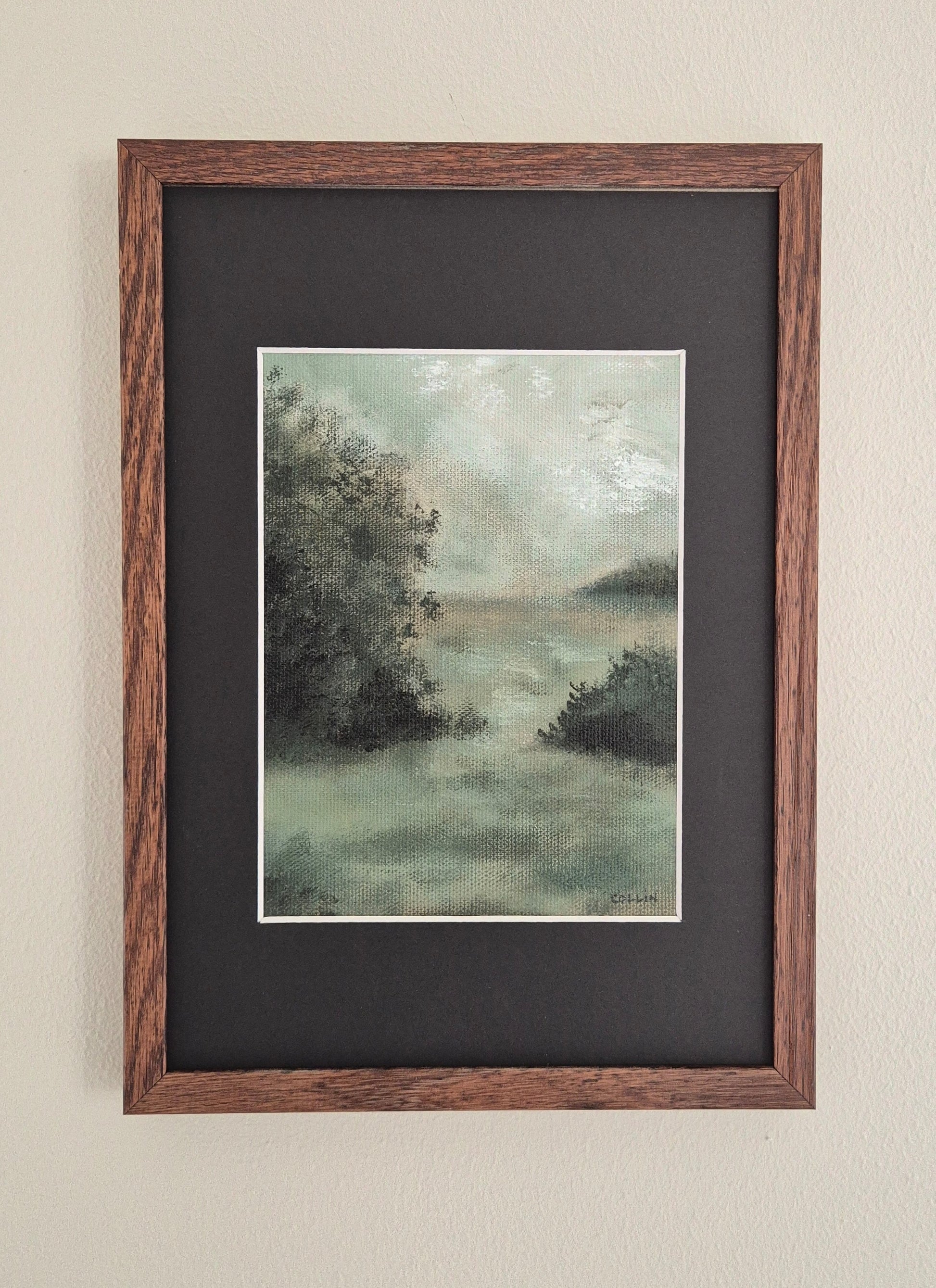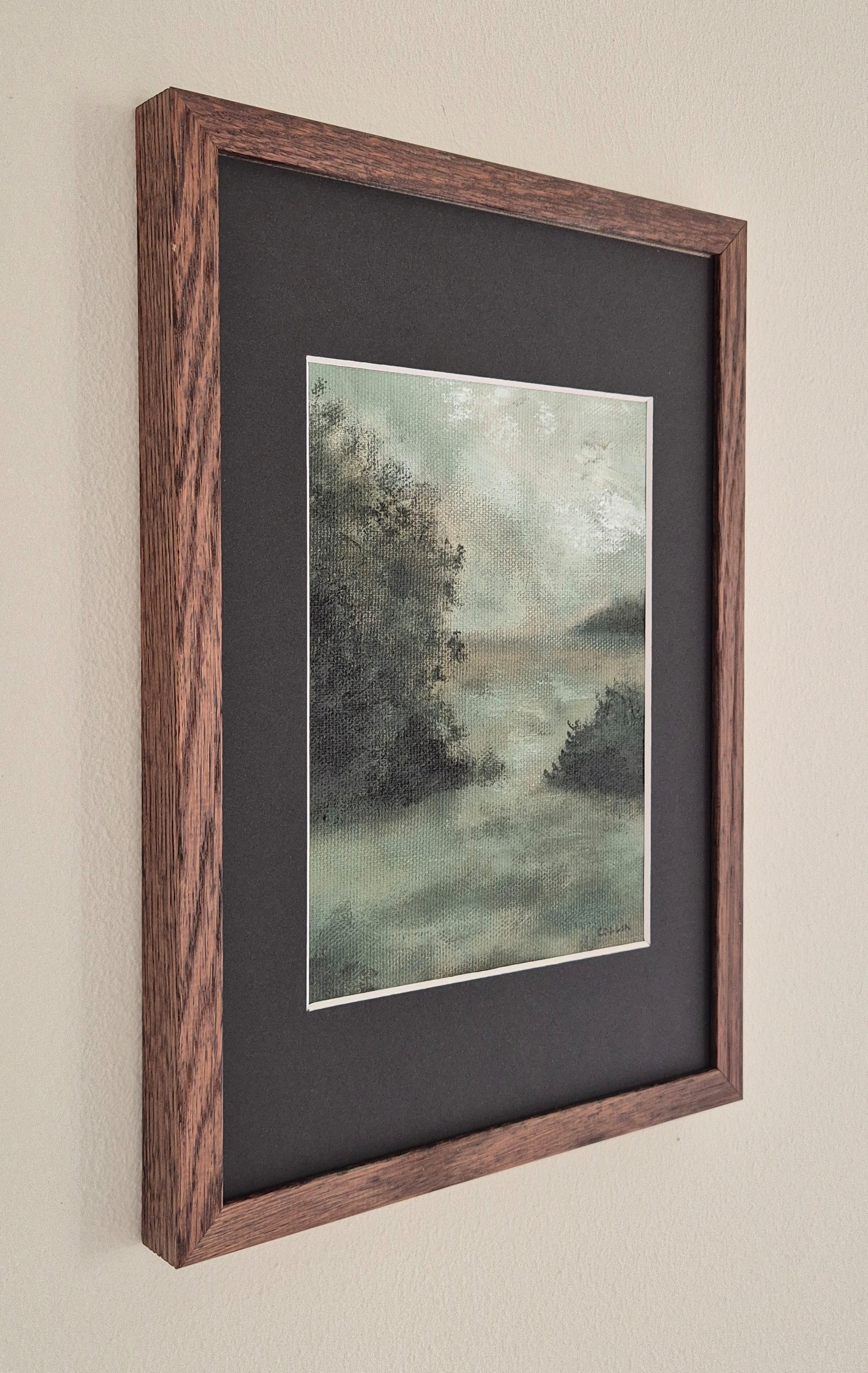 Acrylic on canvas, 20x30 cm, brown wooden frame with glass.
