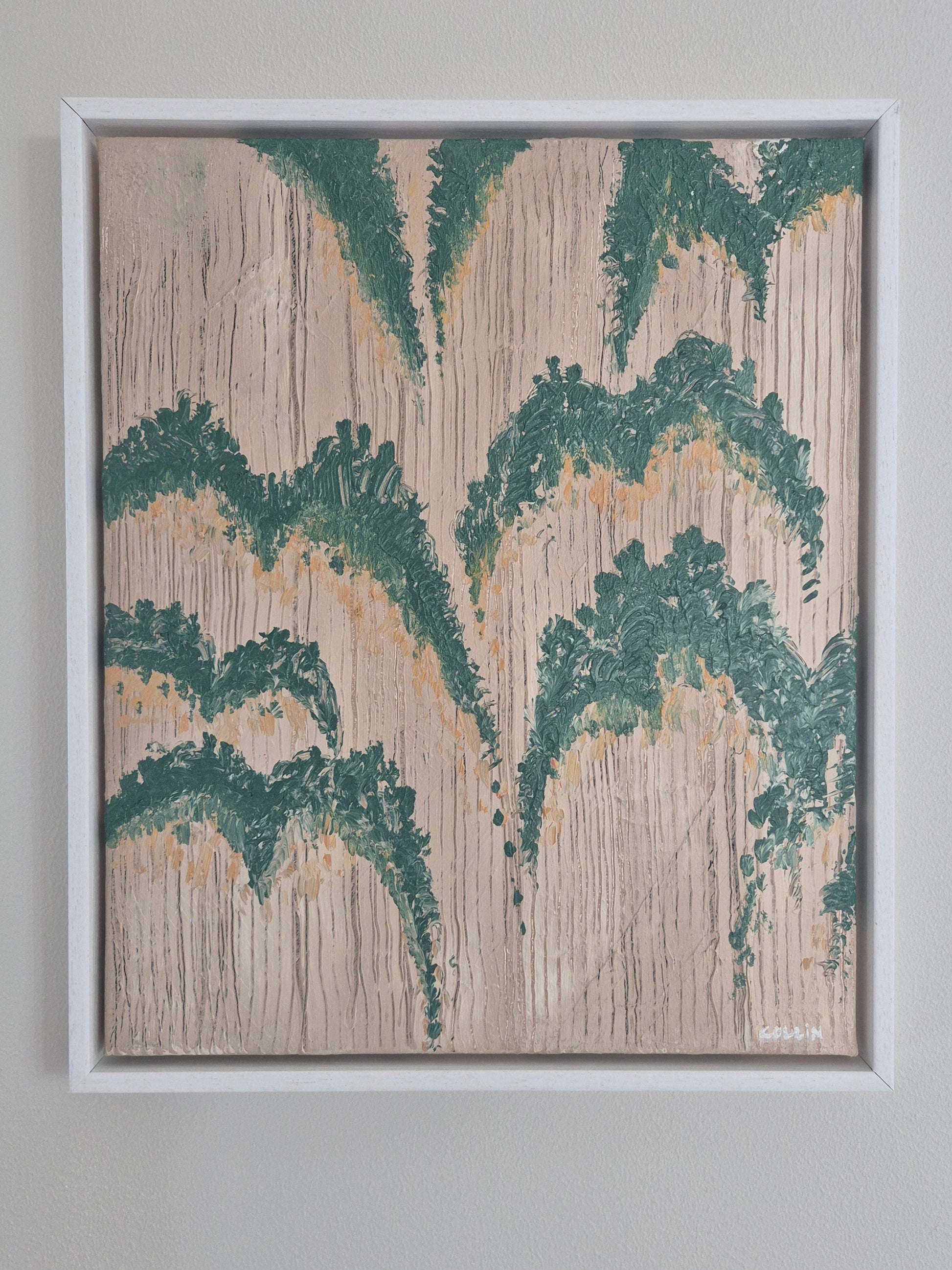 Acrylic and oil on canvas, approx. 41x49 cm, white wooden frame